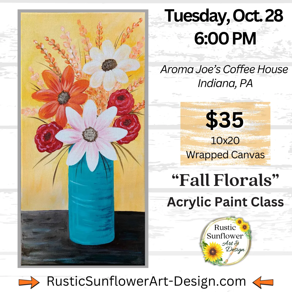 Join me for a creative, coffee-filled evening as we paint this bright fall floral bouquet together! Whether you’re a total beginner or just looking for a relaxing night out, you’ll leave with a painting you’ll be proud of, and a smile to match.!