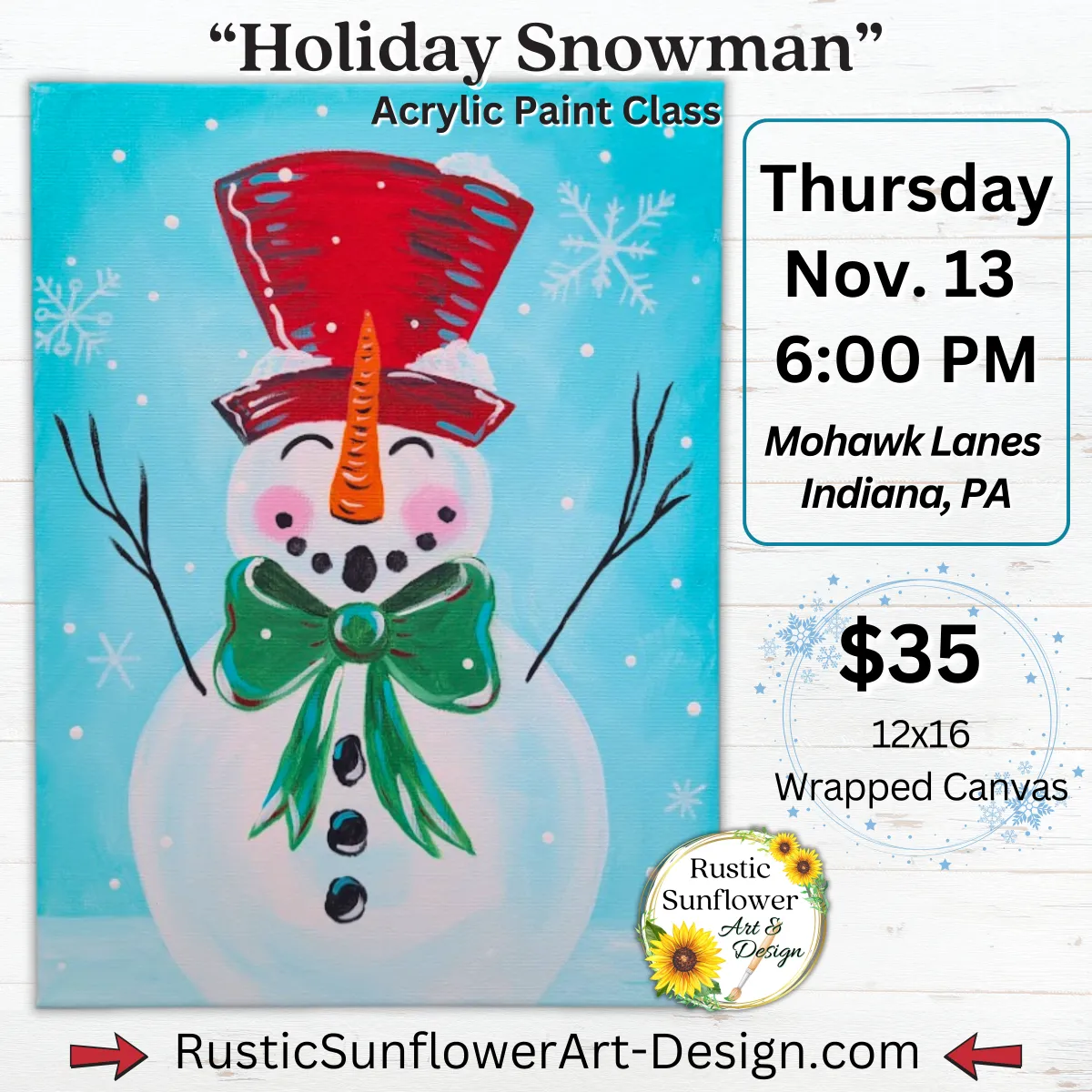 Join us for a festive Snowman Paint Night on Nov 13, 6–8:30 PM.