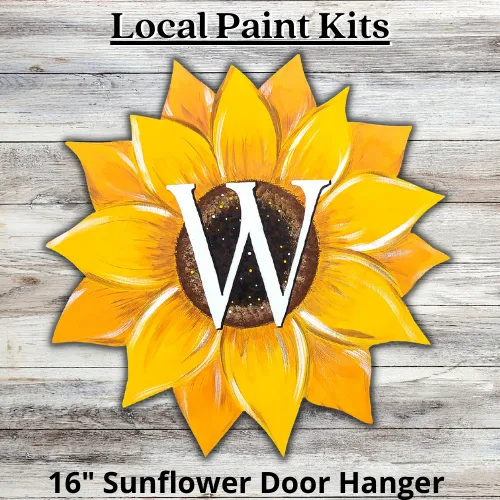 Each 16" Sunflower Door Hanger comes with a wood cutout, printed instructions or a QR code to a video tutorial (if available), paint colors pictured, a printed Last Initial, tracing paper, and twine for hanging.